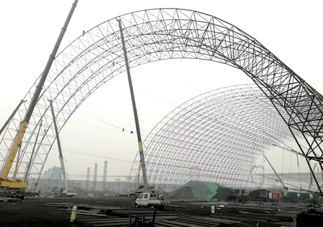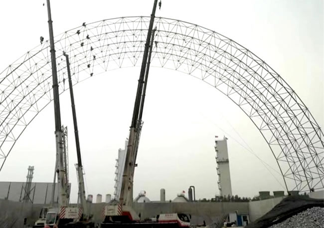 球形網架施工方案  1、工程概況和總體部署  網架采用正放四角錐形式,采用螺栓球接點,采用普通鋼管材,采用兩側焊接水平支座。  網架采用聚碳酸酯屋面,采用小立柱找坡的單向內排水方式,天溝鋼板厚度6mm?! ?...